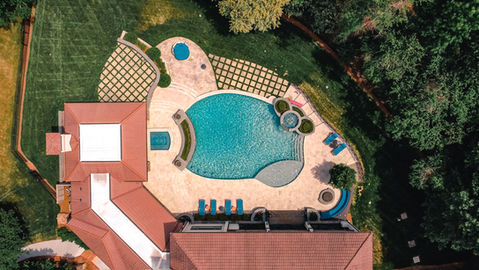 The large concrete swimming pool has a Mediterranean flair, with terracotta-tiled edges and a Spanish-style pool house featuring arched windows and a red-tiled roof. A separate, year-round spa is close to the pool house, surrounded by wrought-iron fencing. The travertine deck extends around the pool, leading to a large circular firepit, ideal for family gatherings. Curved lobe bands are integrated into the design, creating cozy areas for lounging and entertaining while maintaining an elegant, cohesive look.
