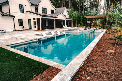 This expansive concrete swimming pool features a dual design with a shallow wading pool on one side and a large swimming area on the other, connected by a sleek channel for easy flow between the two. A raised wall at the back showcases sheer stainless steel waterfalls, adding a modern touch and the soothing sound of flowing water. Facing the house is a luxurious spa with a spillway that gently cascades into the pool. The entire space is wrapped in an elegant marble deck, providing a polished, sophisticated surface that ties the design together with a touch of luxury. Oh and not to forget it can rain from the pergola :)